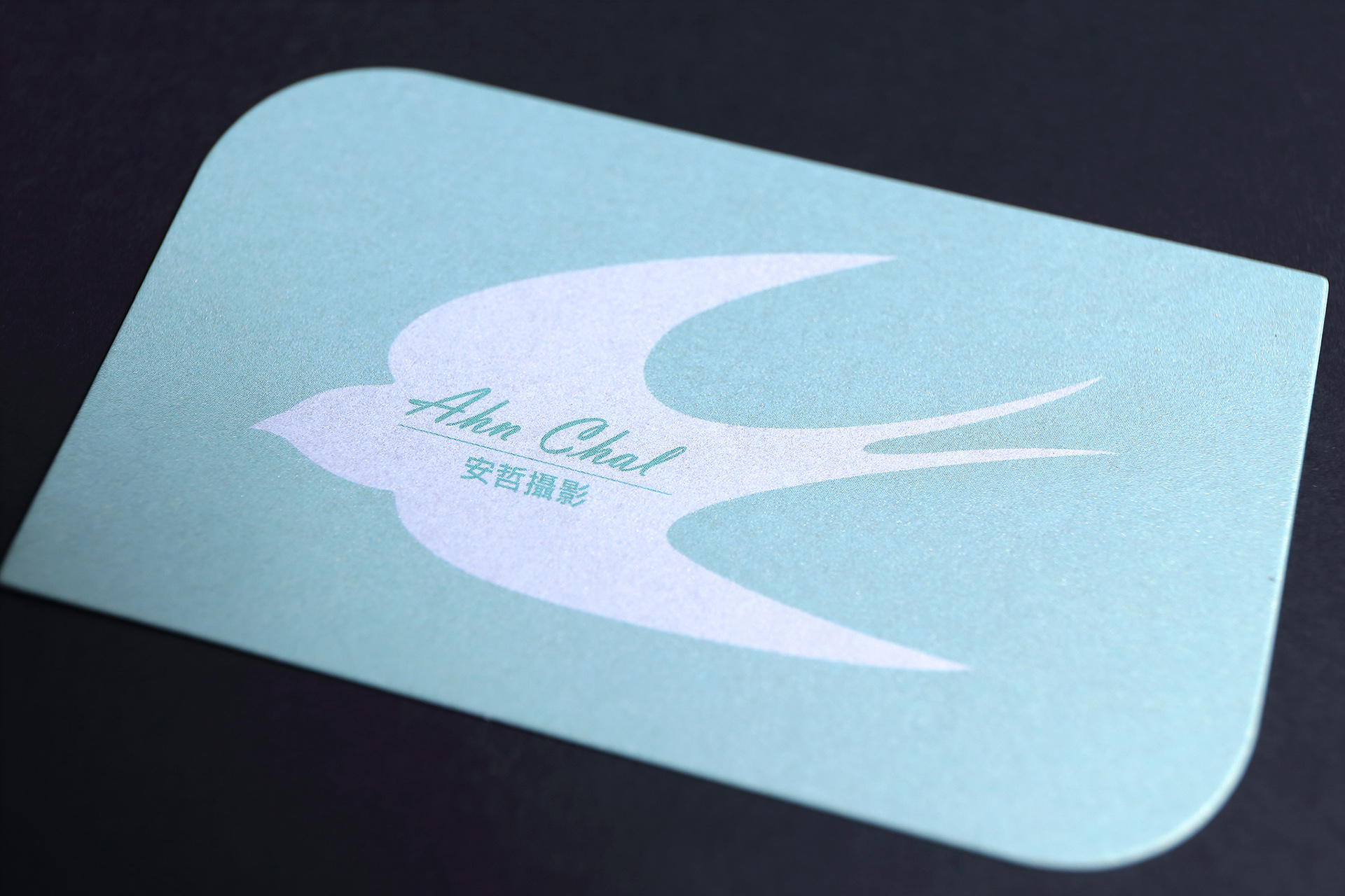 創意理念╱以像婚紗又似浪花的曲線形狀,搭配簡約輕快的青綠色,呼應安哲的攝影風格與精神,增添浪漫感。有別於一般婚紗攝影師的華麗浪漫,帶給客戶簡約輕盈的感動。