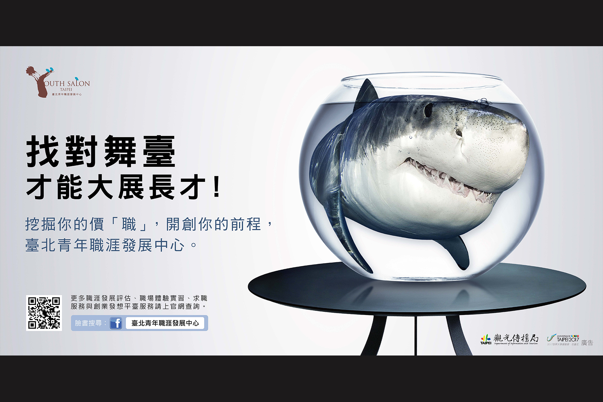 創意理念╱以適才適用的概念,把兇猛大型的鯊魚放到尺寸不符的魚缸裡,間接運用強烈對比來突顯每種優勢與環境搭配之重要性。穎脫出一般徵才廣告,使單一目標達到吸睛效果,引導觀看者第一眼先將畫面印入腦海,再細細思索箇中寓意。